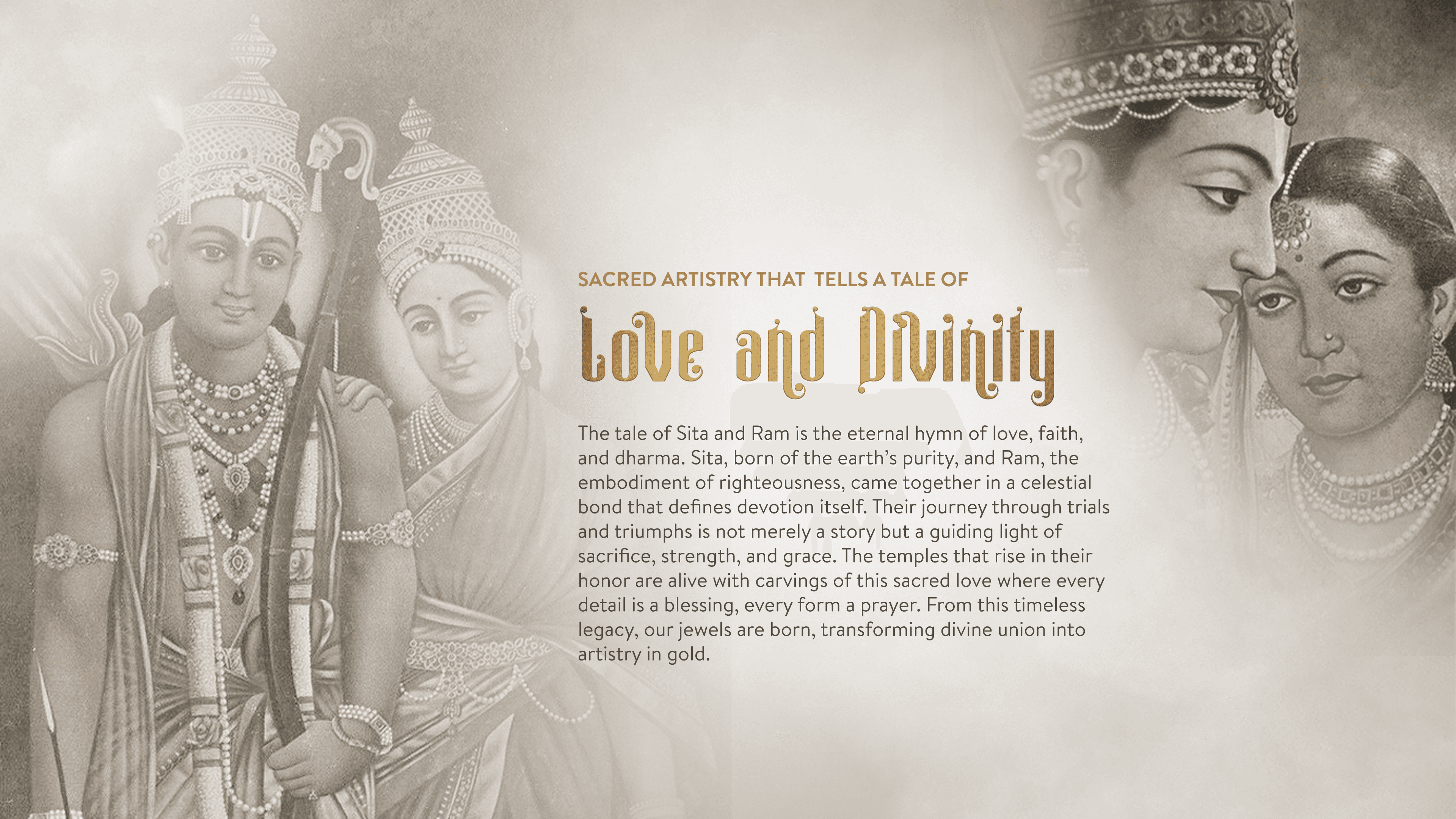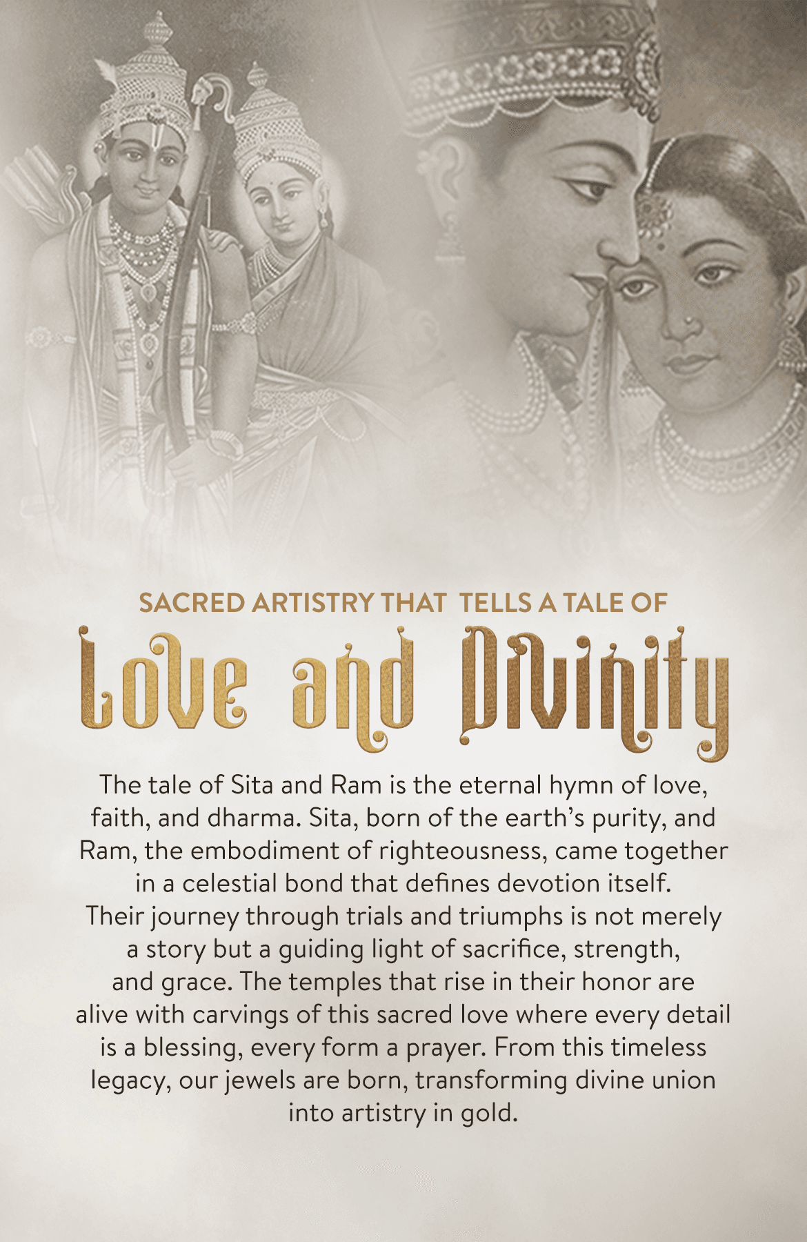 This jewel is imagined as more than ornament , it is a prayer in gold, a symbol of divine union. Inspired by the eternal story of Sita and Ram, every detail is crafted to echo their blessings and grace. In its brilliance lives their dharma and their timeless love.