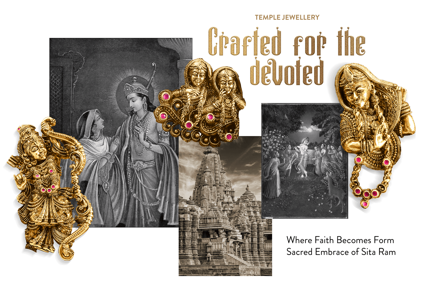 What began as a vision inspired by temple sculptures of Sita and Ram was shaped into life by masterful hands. Wax moulds carried the outlines of divinity, molten gold gave them permanence, and gemstones infused them with celestial radiance. Every stroke of craftsmanship became an act of reverence, until the jewel itself shone as a sacred offering , a tribute in gold to love and dharma eternal.