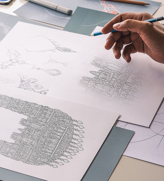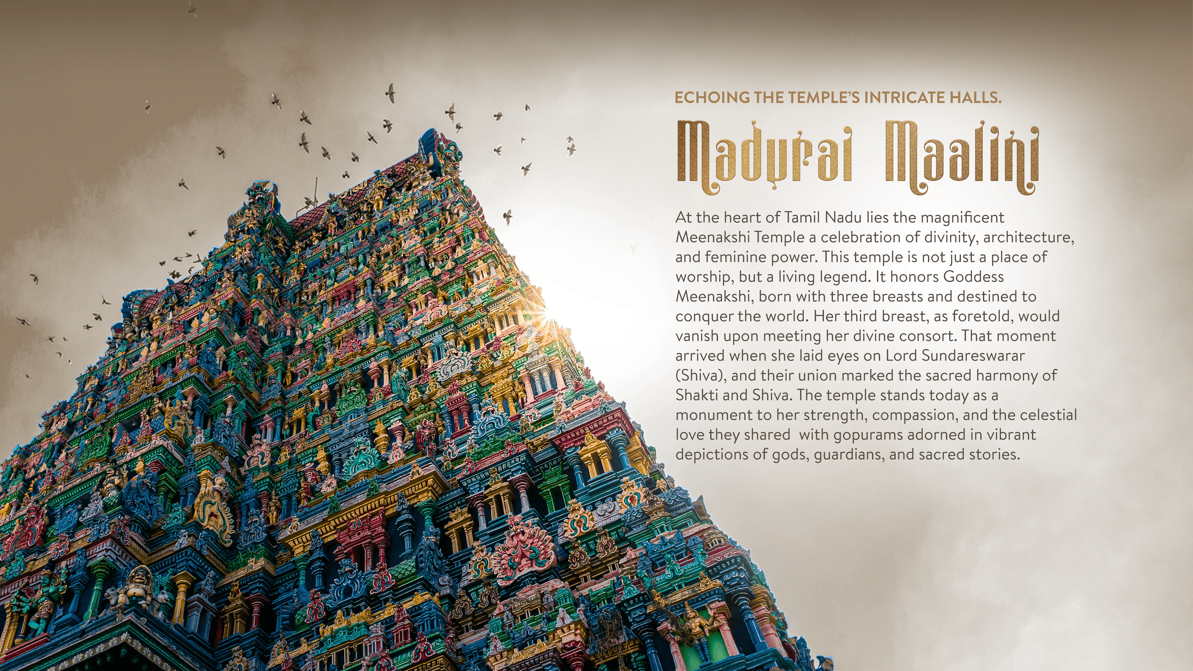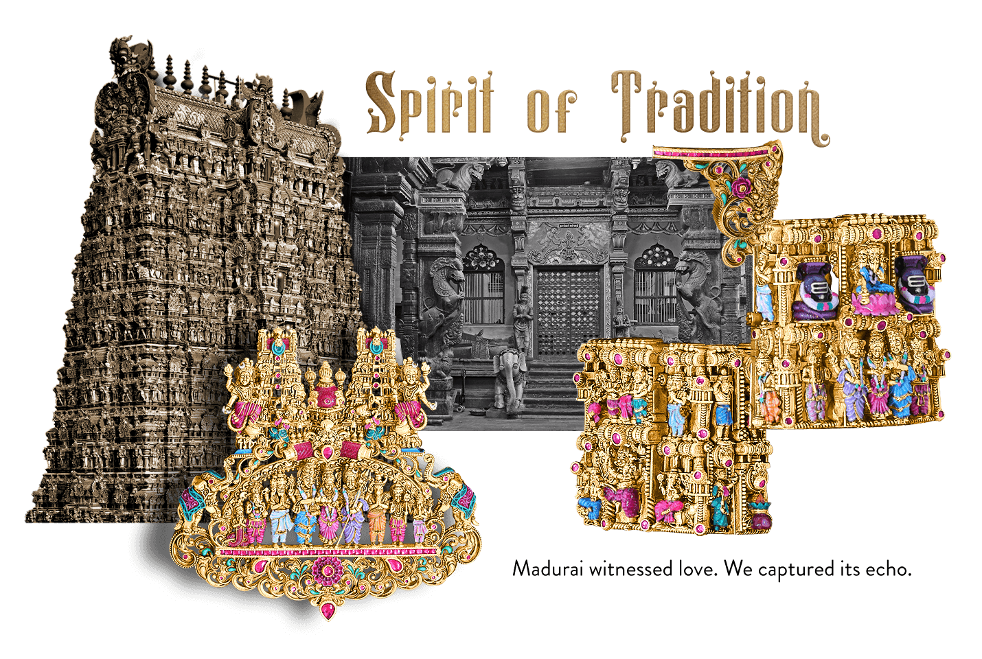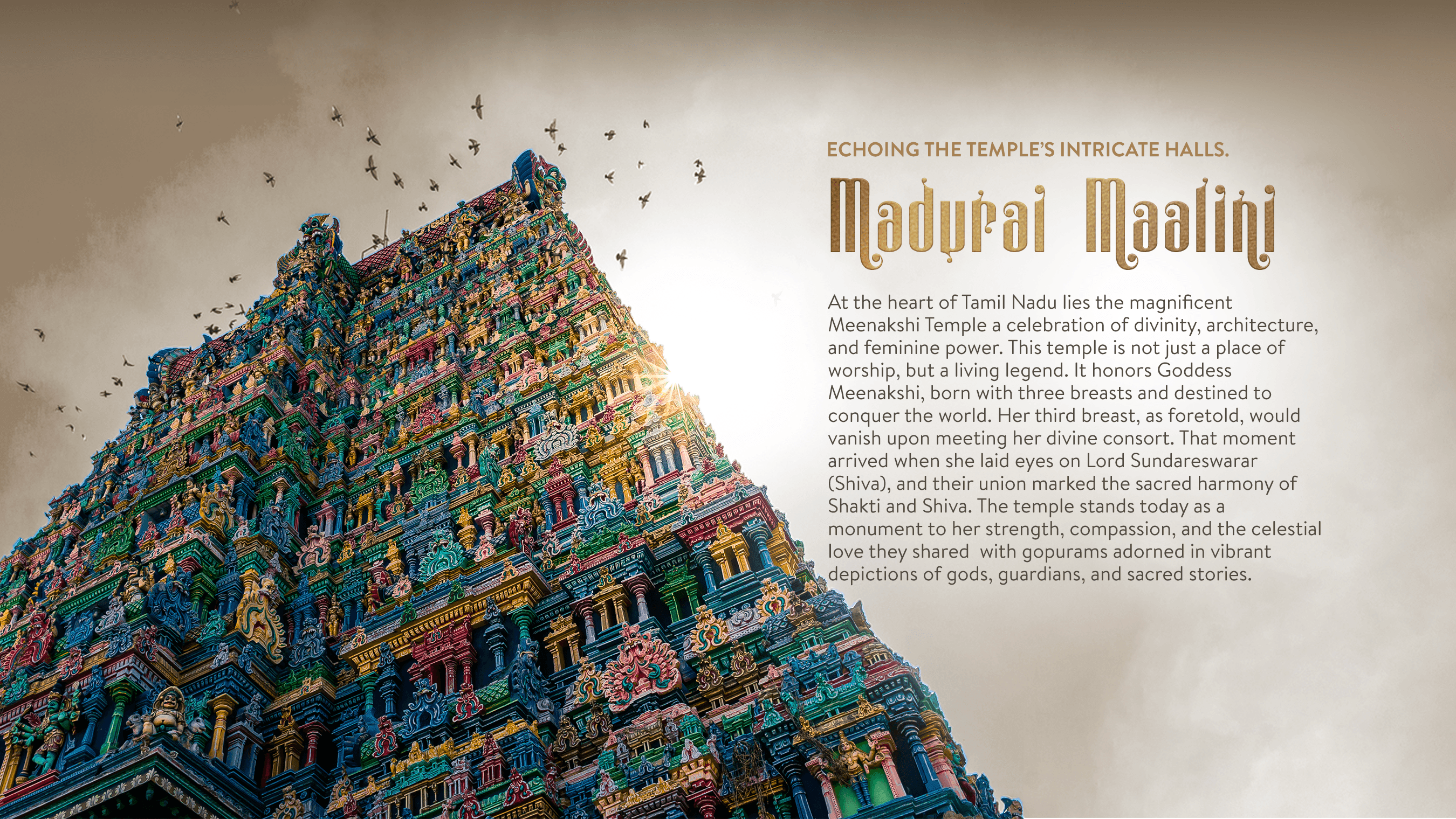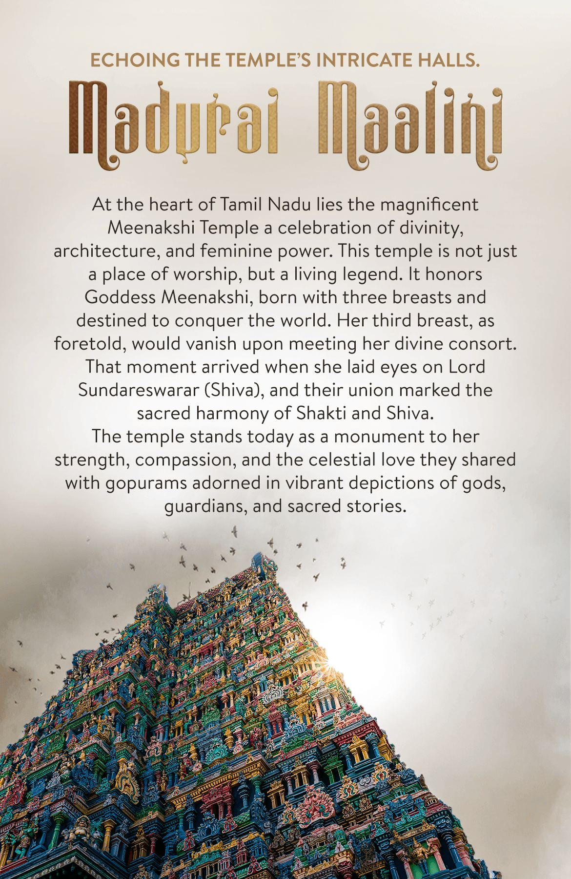 Madurai Maalini is a magnificent creation, a divine offering. Inspired by the vivid sculptures and towering structure of the Meenakshi Temple, this handcrafted piece channels the temple’s architectural grandeur into gold.